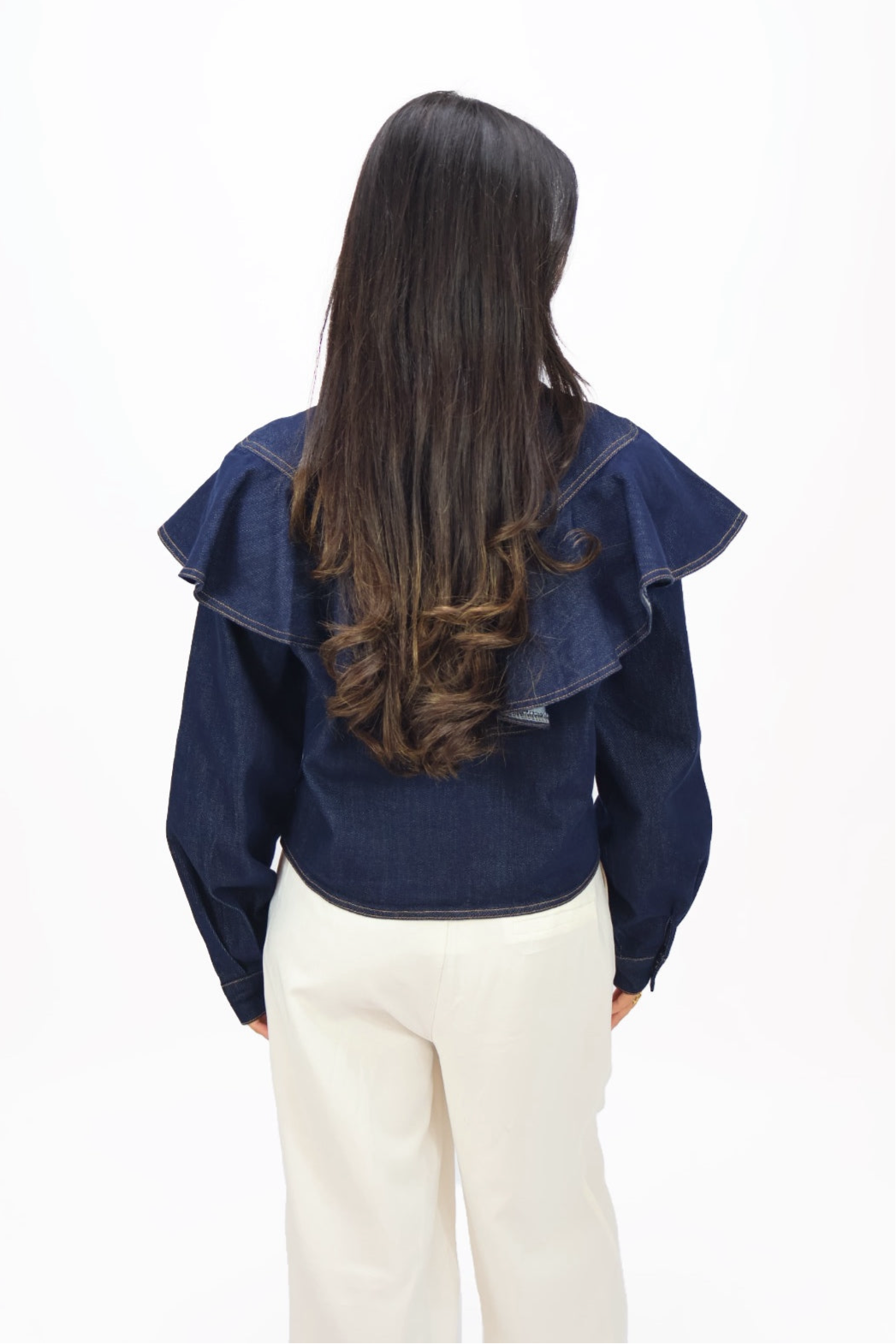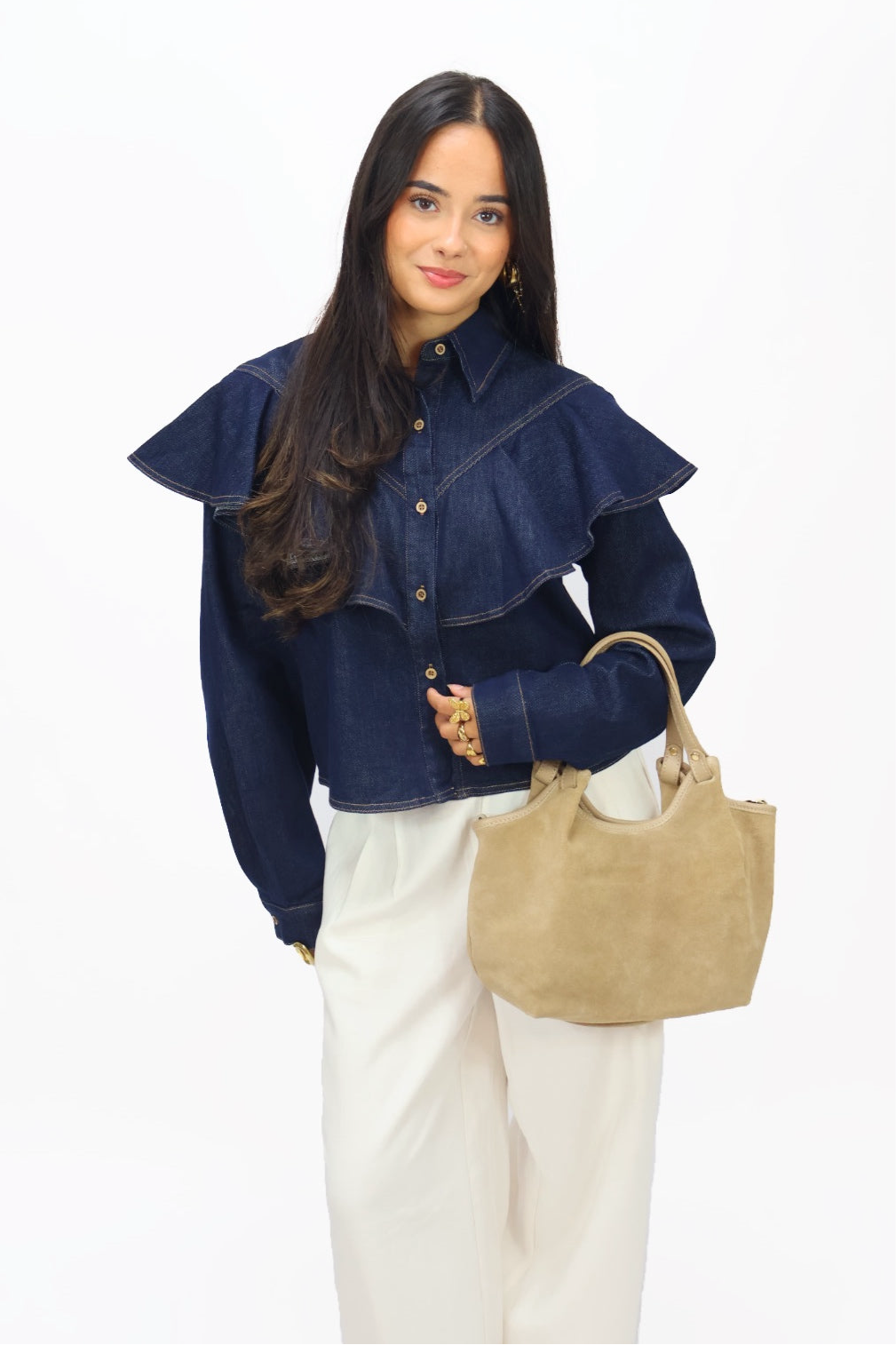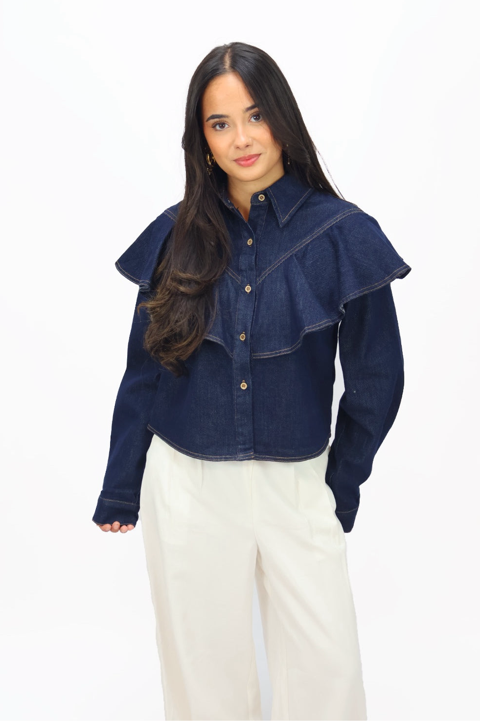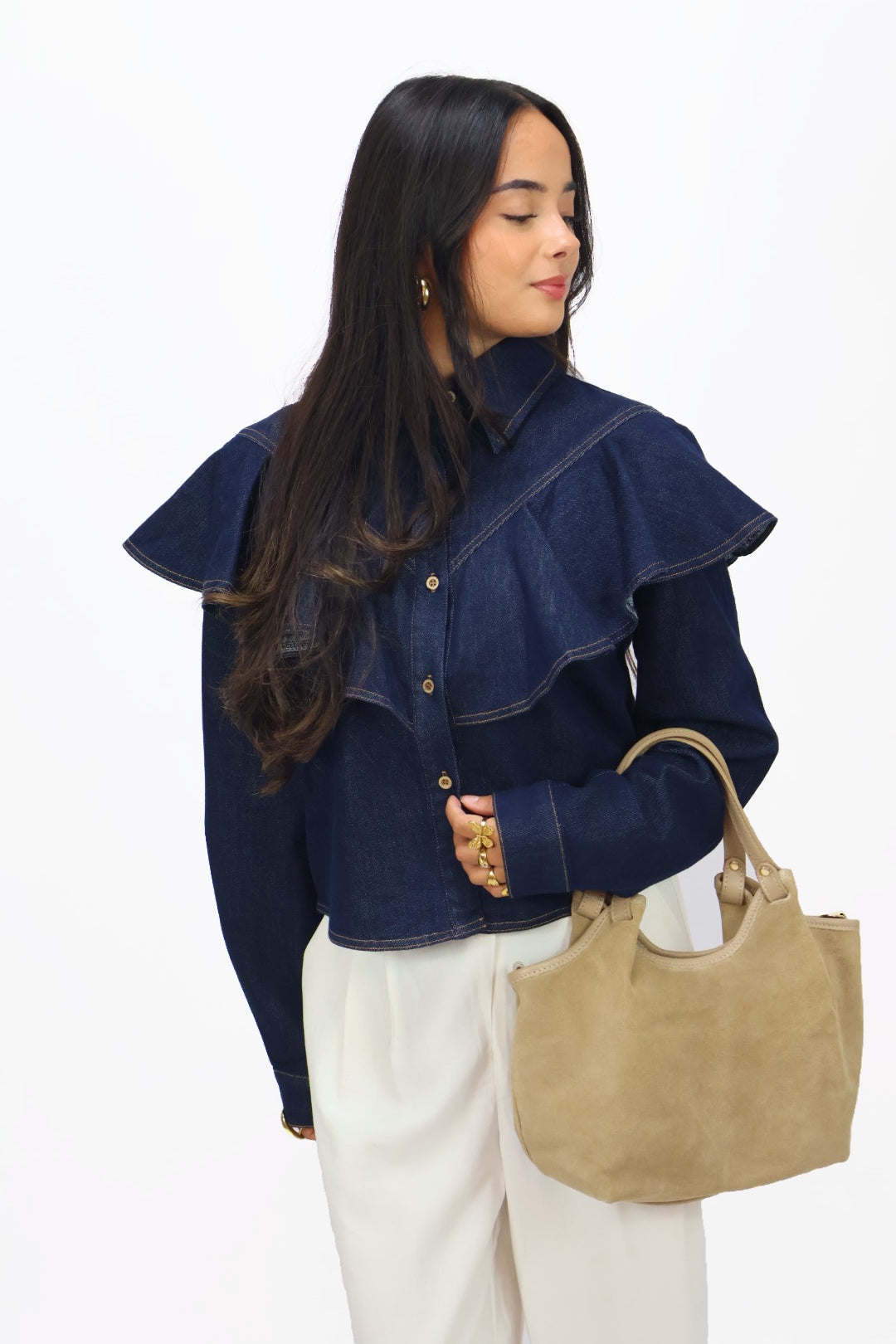 De poncho inspired denim blouse is hét fashion statement van dit seizoen. Het brede ruffle detail geeft de blouse die unieke poncho-look waar iedereen nu voor gaat. Gemaakt van stevig denim met opvallende stiksels: stoer, maar tegelijk super stylish.