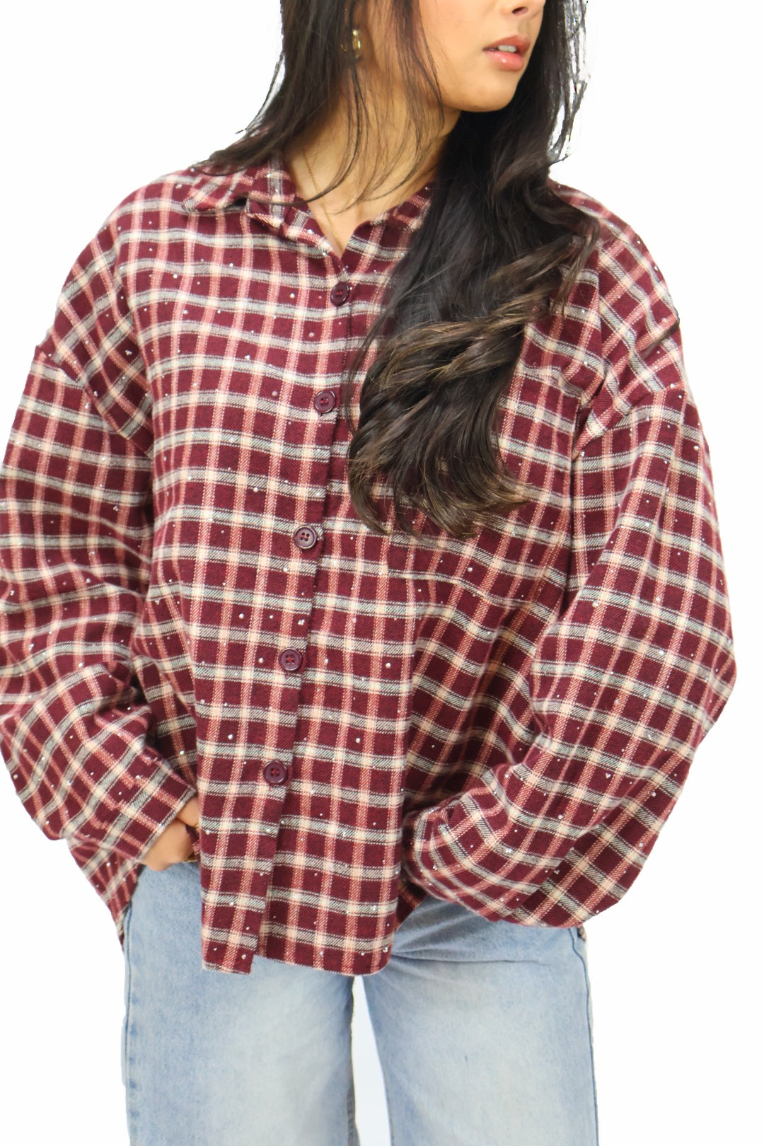 Deze blouse met rhinestones is echt een fashion favorite van dit moment! De combinatie van bordeaux en rhinestones maakt dit item supertrendy en een echte eye-catcher.