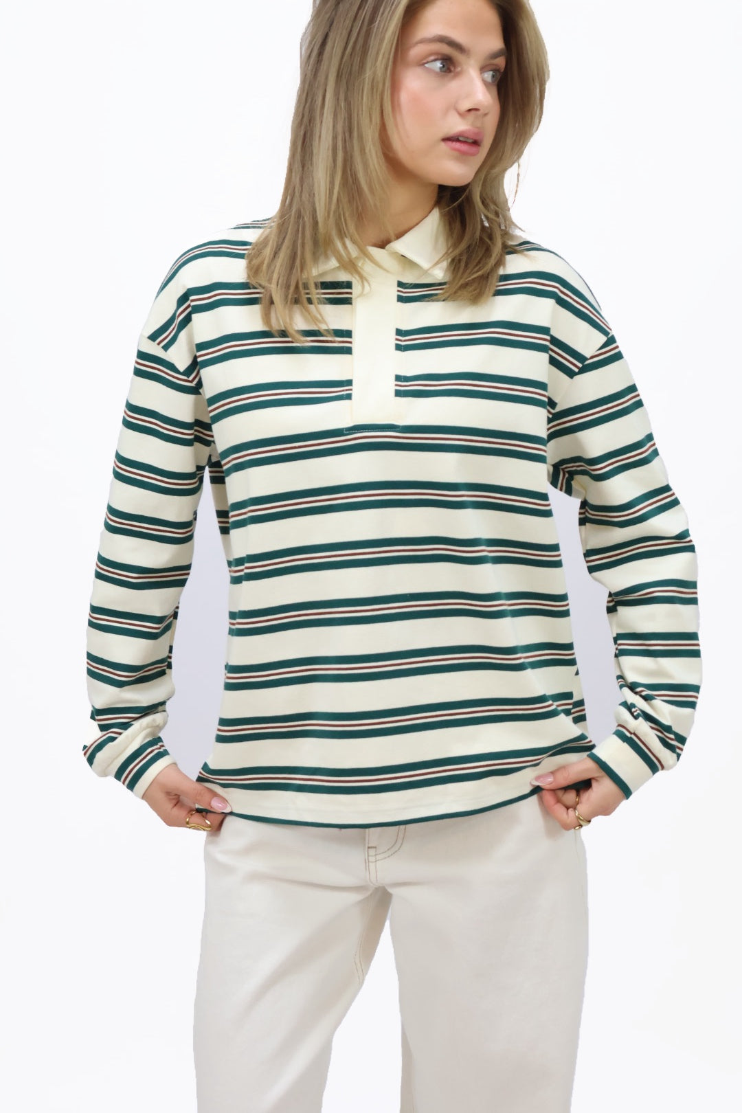 Wij zijn helemaal obsessed door de strepen en polo trend! Dit item is de perfecte toevoeging voor jouw wardrobe. De all-over strepenprint in combinatie met de lange mouwen en het polokraagje maakt het de longsleeve tijdloos. Ook geeft de wit met groene kleur de sweater een trendy & classy touch. Draag de polo longsleeve mega leuk met jouw favoriete pantalon voor een classy look. Of ga voor een jeans en sneakers voor een casual look, its up to you girls.