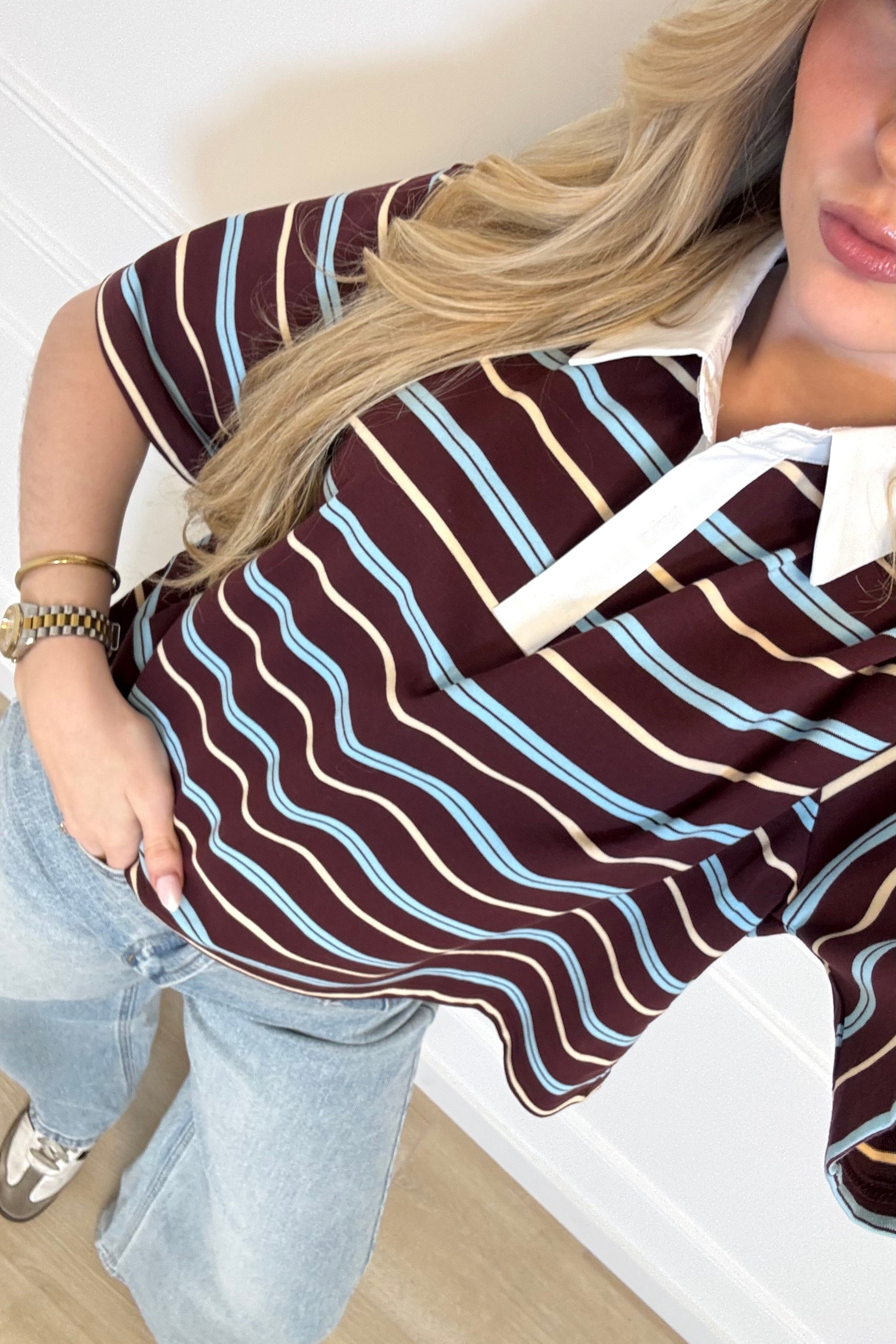 Wij zijn helemaal obsessed door de strepen en polo trend! Dit item is alvast de perfecte toevoeging voor jouw voorjaar wardrobe. De all-over strepenprint in combinatie met de korte mouwen en het polokraagje maakt het een tijdloos item. Tijdens de koude mega leuk te stijlen met een blazer of longsleeve eronder. Draag de polo sweater mega leuk met jouw favoriete pantalon voor een classy look. Of ga voor een jeans en sneakers voor een casual look, its up to you girls. Ook beschikbaar in het bordeaux