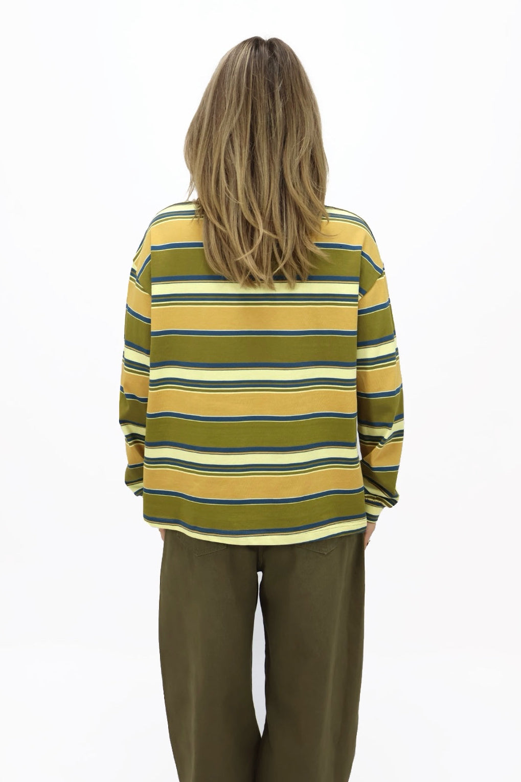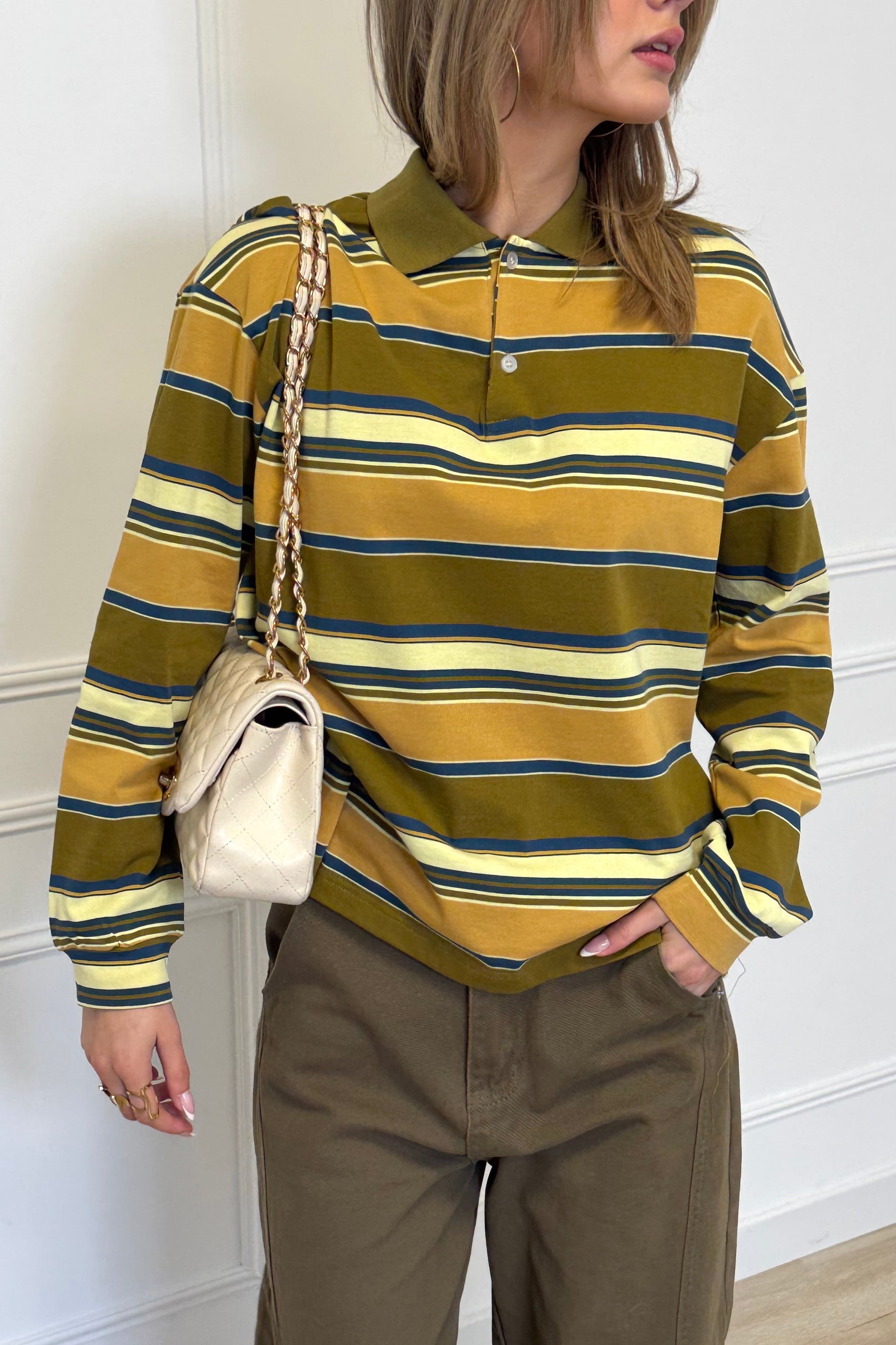 Wij zijn helemaal obsessed door de strepen en polo trend! Dit item is de perfecte toevoeging voor jouw wardrobe. De all-over strepenprint in combinatie met de lange mouwen en het polokraagje maakt het de sweater tijdloos. Ook geeft de groene kleur de longsleeve een trendy & eye-catching touch. Draag de polo longsleeve mega leuk met jouw favoriete pantalon voor een classy look. Of ga voor een jeans en sneakers voor een casual look, its up to you girls.