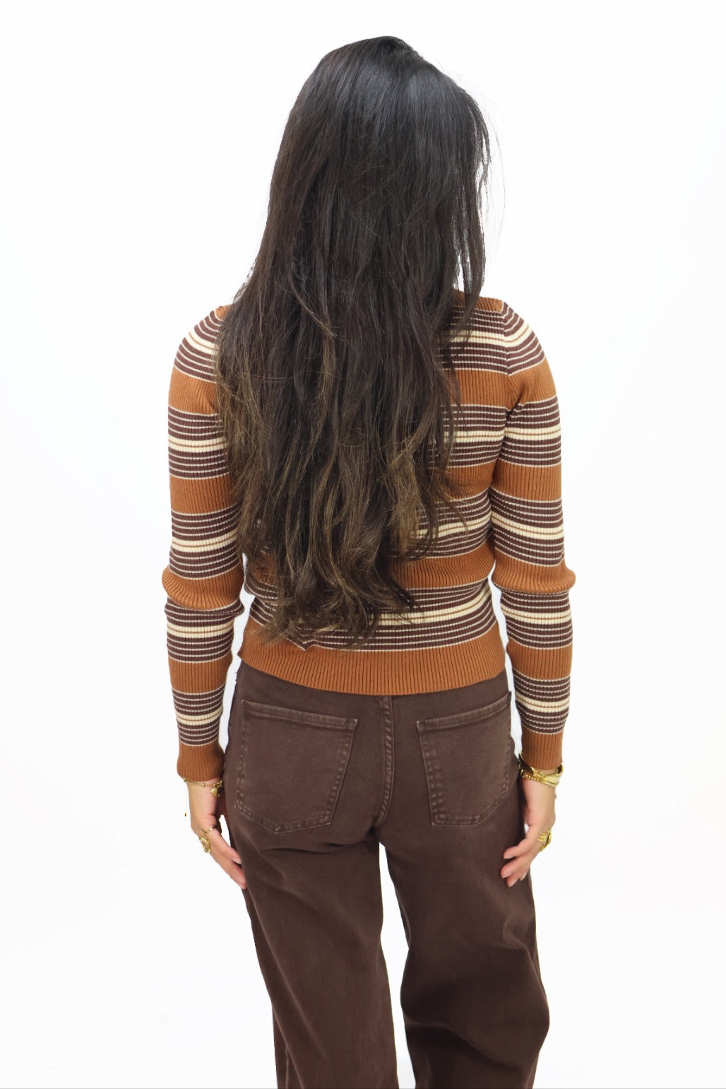 Een clean en veelzijdig item met een subtiele retro touch. Dit aansluitende topje heeft een polokraag met knoopsluiting aan de bovenkant en een gestreept patroon dat perfect past bij de fall vibe. Draag hem casual met jeans of combineer met een pantalon voor een wat nettere look.
