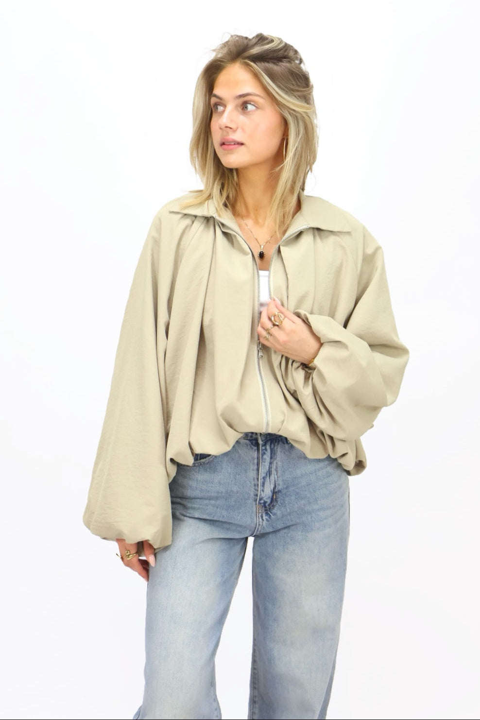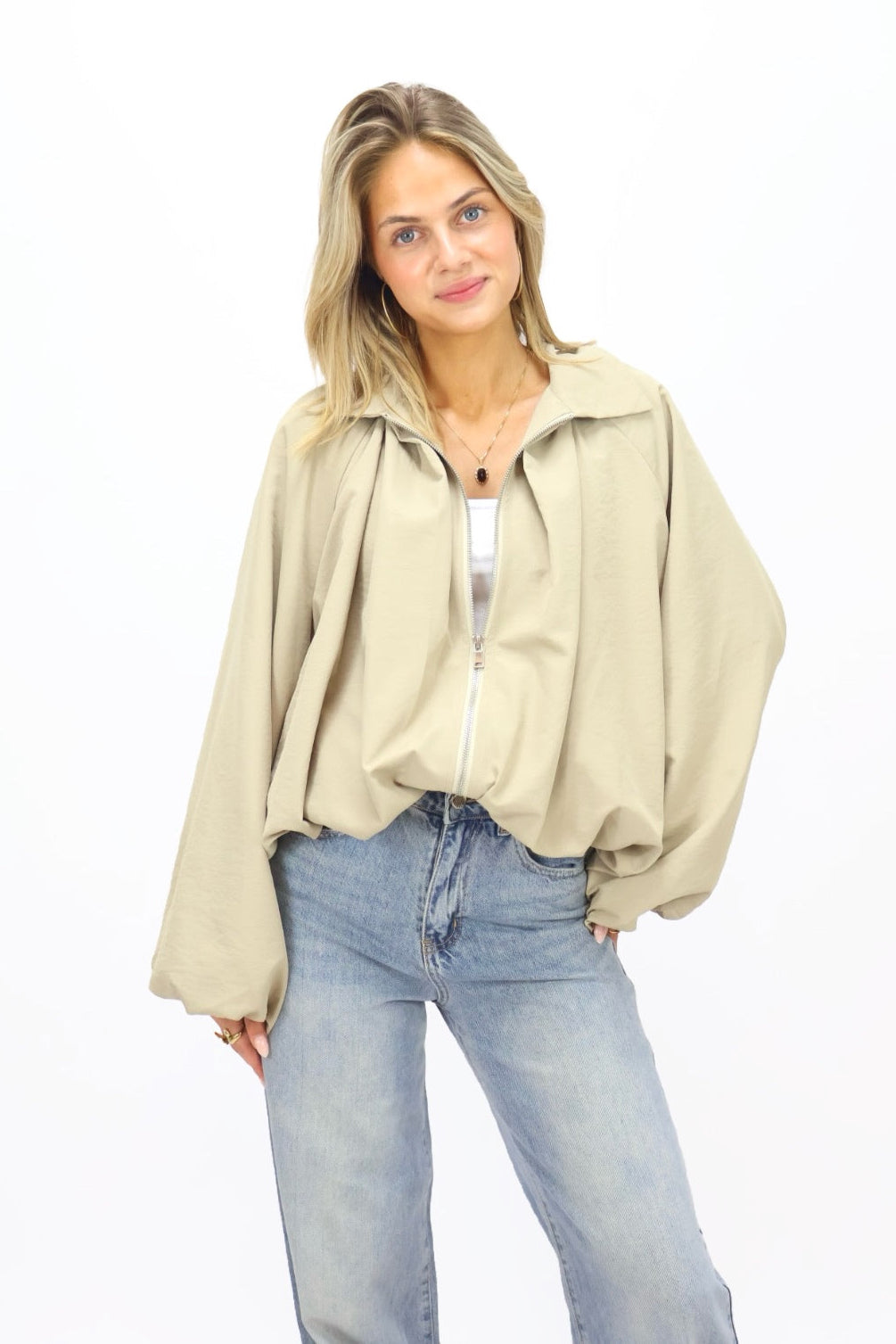 Deze beige jas is dé perfecte combinatie van comfy en stijlvol. De losvallende fit en ballonmouwen geven een nonchalante, trendy look. De zachte stof valt soepel en de rits maakt 'm super easy om snel over je outfit te gooien.