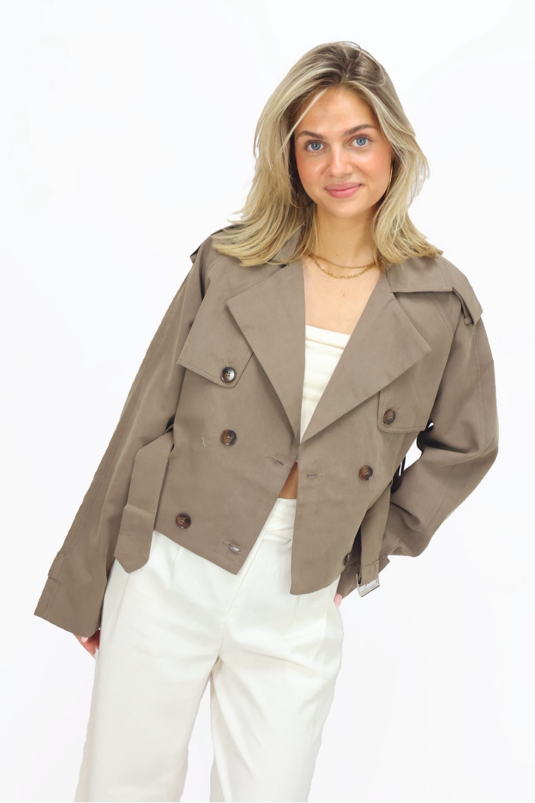 Til je look naar een hoger niveau met deze cropped trenchcoat in een elegante taupe tint. De klassieke details zoals de double-breasted knoopsluiting, epauletten op de schouders en ceintuurdetails op de mouwen geven een tijdloze, sophisticated uitstraling. Dankzij de cropped lengte krijgt dit iconische model een moderne twist — perfect om over een high-waist pantalon of een jeans te dragen. Gemaakt van een stevige maar soepelvallende stof voor optimaal draagcomfort én stijl.