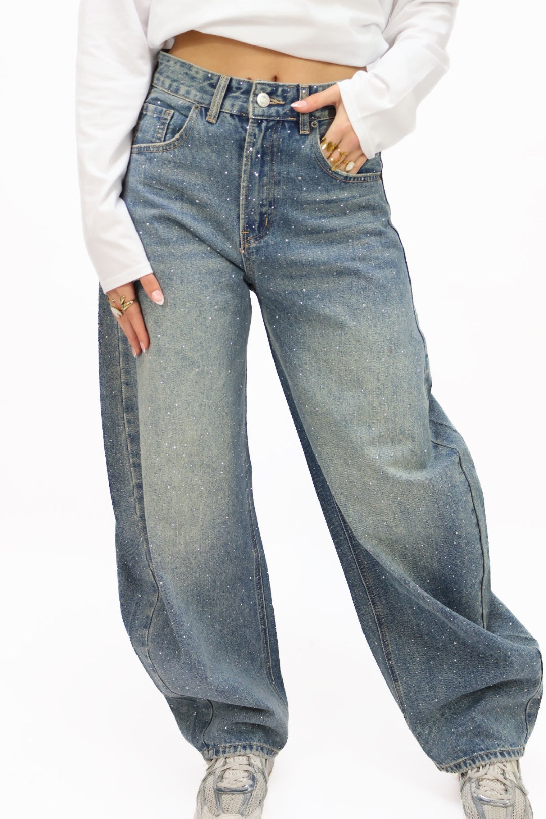 De Balloon Jeans is een echte must-have dit seizoen en ze zijn momenteel mega HOT! Deze jeans heeft een losse fit met een subtiele ballonvorm, wat zorgt voor een trendy, effortless look. De stevige denim valt mooi en voelt comfortabel aan, en de subtiele rhinestones geven de broek net dat beetje extra sparkle, perfect om op te vallen zonder te overdrijven.